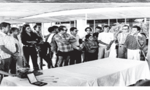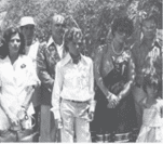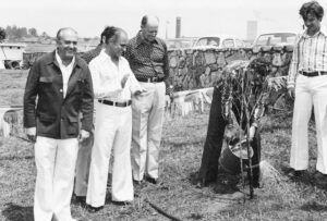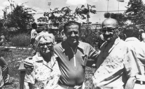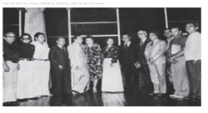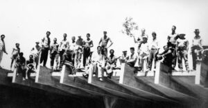 Foto mostrando fundadores e pioneiros às margens do Lago à pedido do Presidente JK.