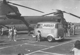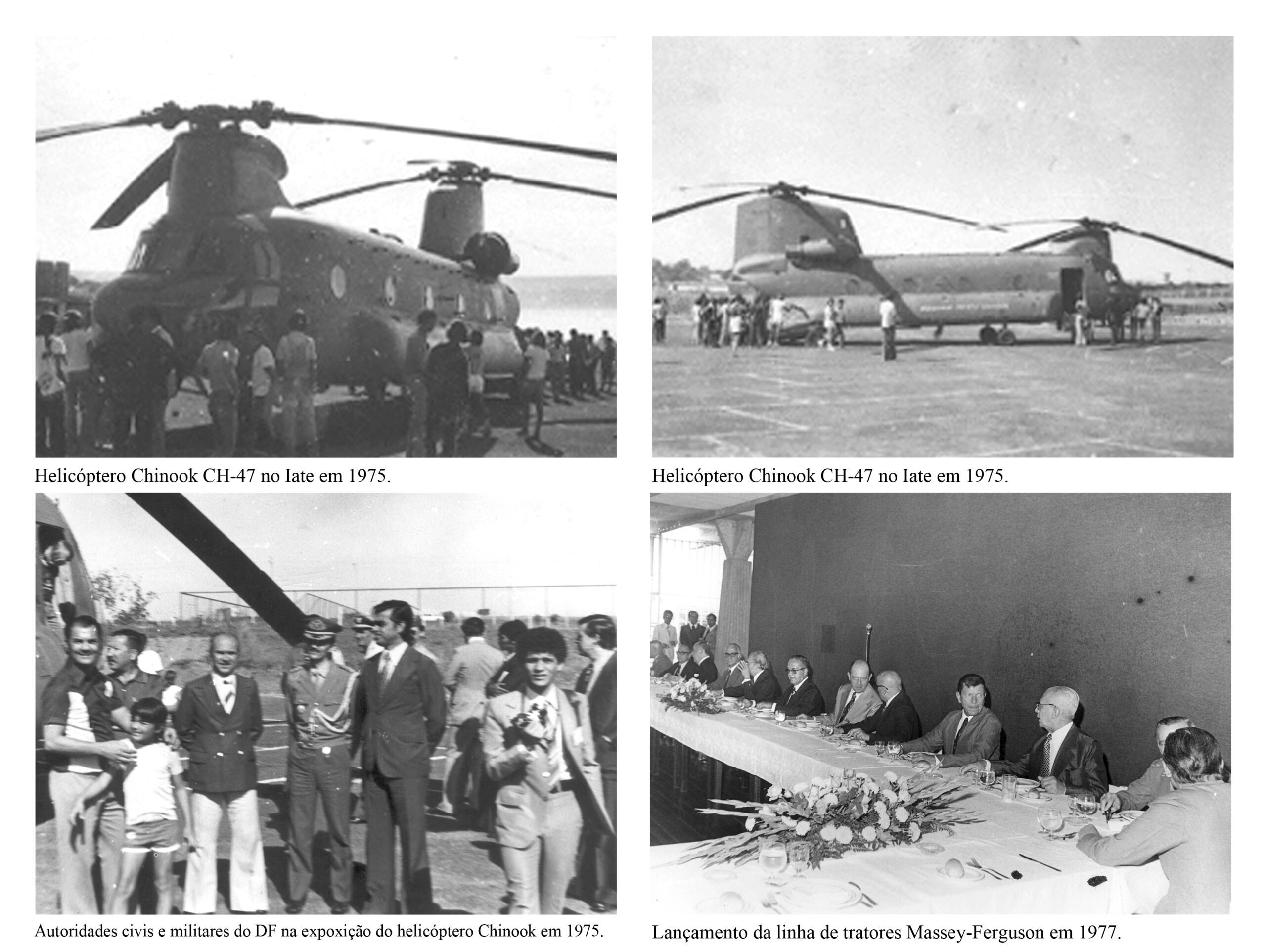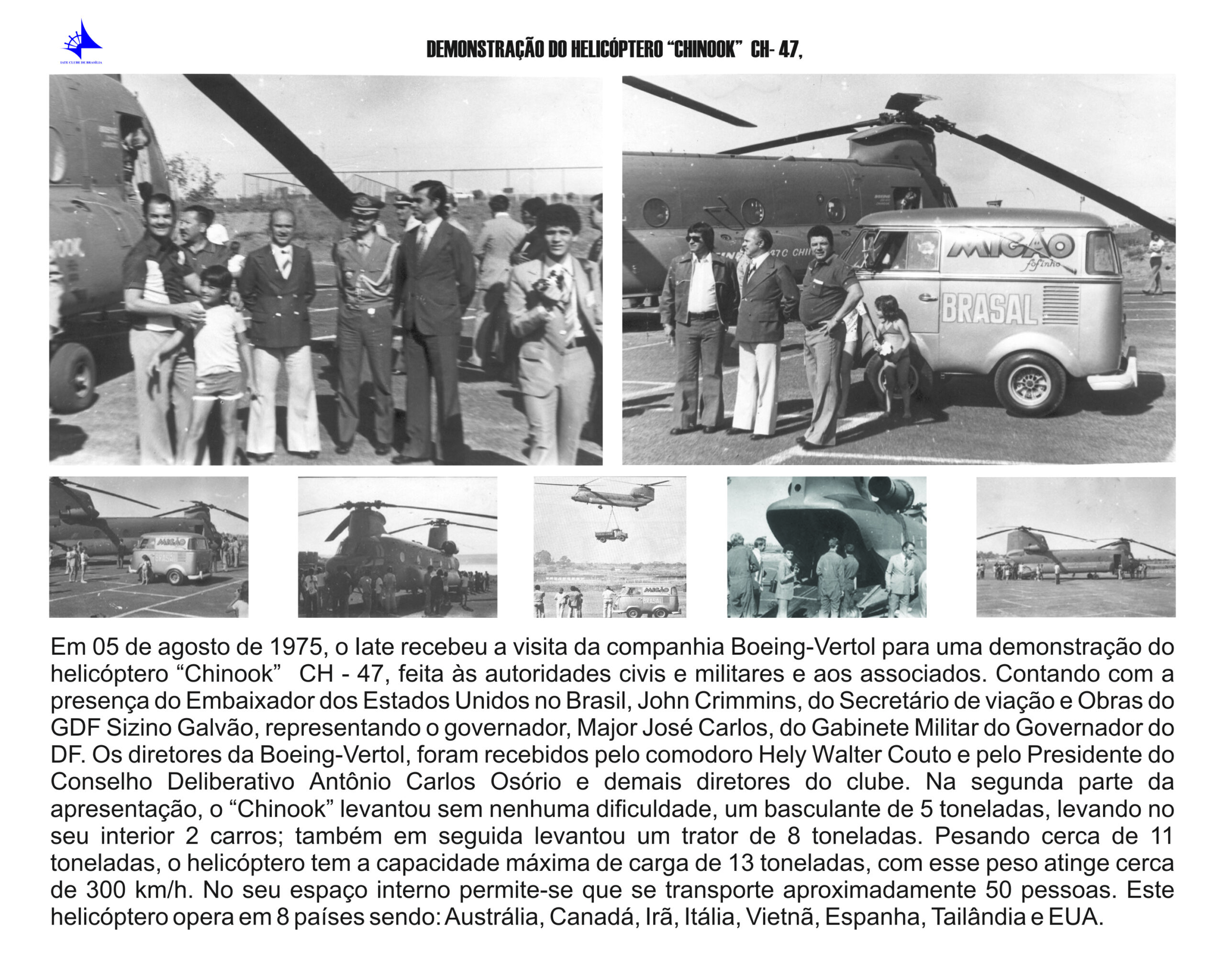 Ainda em 1975, o Iate Clube de Brasília foi palco de uma impressionante demonstração do helicóptero Chinook CH-47, da companhia Boeing-Vertol. O evento reuniu autoridades civis e militares da capital, incluindo o Embaixador dos Estados Unidos no Brasil, John Crimmins, e o Secretário de Viação e Obras do GDF, Sizino Galvão. Durante a exibição, a aeronave demonstrou sua extraordinária capacidade de carga ao erguer um basculante de cinco toneladas com dois carros em seu interior e, em seguida, suspender um trator de oito toneladas, impressionando o público presente.