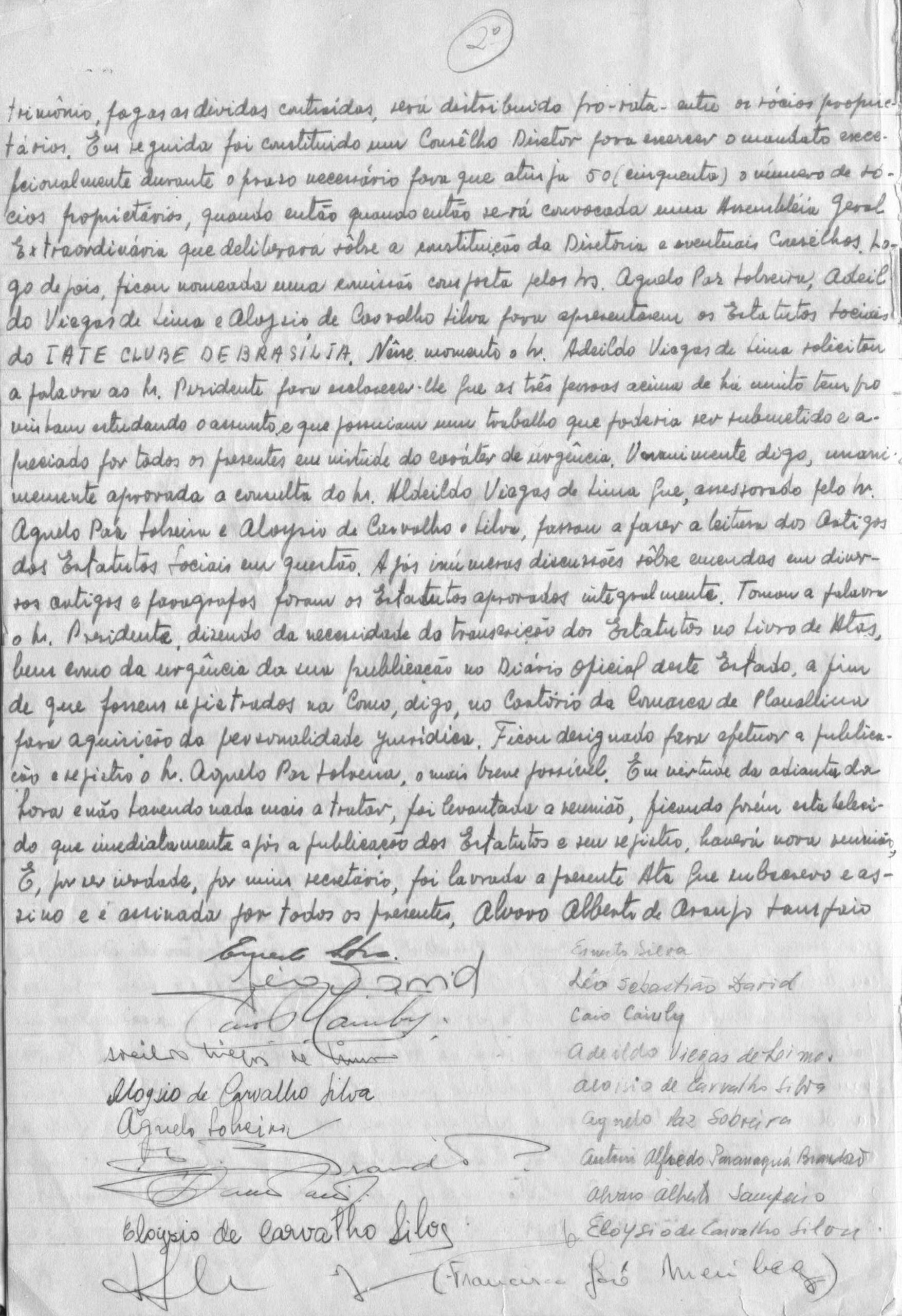 Poucos dias depois, em 7 de abril de 1960, foi realizada a primeira Assembleia Geral dos Fundadores, que contou com a presença de 25 membros. Nessa ocasião, foi aprovado o Estatuto do Clube, e o então presidente da República, Juscelino Kubitschek, foi eleito Patrono do Iate Clube de Brasília, em reconhecimento à sua contribuição para o país e sua afinidade com os ideais do clube. Também foi formada a Comissão Organizadora, composta por Geraldo Carneiro, Sylvio Pedrosa e Newton Andrade, que assumiu a responsabilidade de dar continuidade à organização e edificação do Iate Clube.